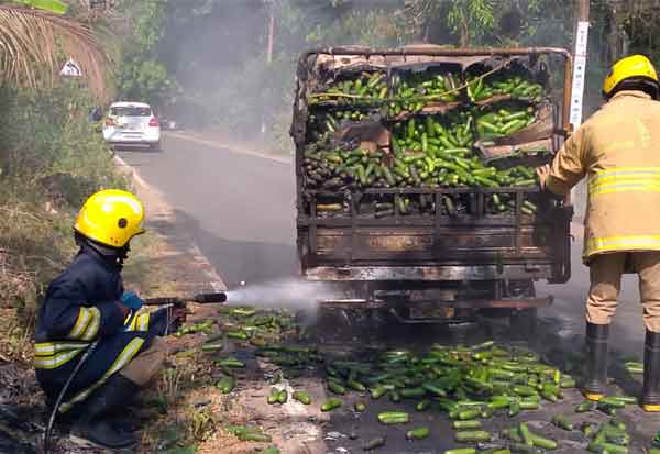 பெரியகுளம் சோத்துப்பாறை ரோட்டில் வெள்ளரிக்காய் ஏற்றி சென்ற லோடு ஆட்டோ தீ பிடித்தது. தீயணைப்பு வீரர்கள் தீயை அணைத்தனர். டிரைவர் சித்திக் அதிர்ஷ்டவசமாக உயிர் தப்பினார்.