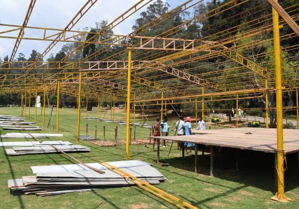 ஊட்டி தாவரவியல் பூங்காவில், கோடைவிழா துவக்கத்தை முன்னிட்டு மேடை அமைக்கும் பணி நடக்கிறது.