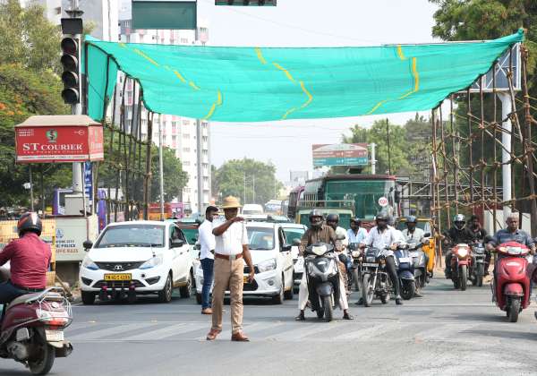 கோவையில் நாளுக்கு நாள் வெயிலின் தாக்கம் அதிகரித்து போவதால் சிக்னலில் நிற்கும் இருசக்கர வாகன ஓட்டிகளை வெயிலிலிருந்து பாதுகாக்கும் வகையில் அமைக்கப்பட்டுள்ள பசுமை பந்தல். இடம்: கோவை மேட்டுப்பாளையம் ரோடு சங்கனூர் சிக்னல்.