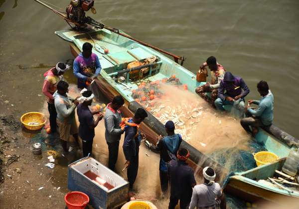 கடலூர் மீன் பிடி துறைமுகத்தில் பைபர் படகில் சென்று இழுவை வலையில் சிக்கிய மீன்களை பிரித்து எடுக்கின்றனர். இடம் கடலூர் முதுநகர் மீன்பிடி துறைமுகம்.
