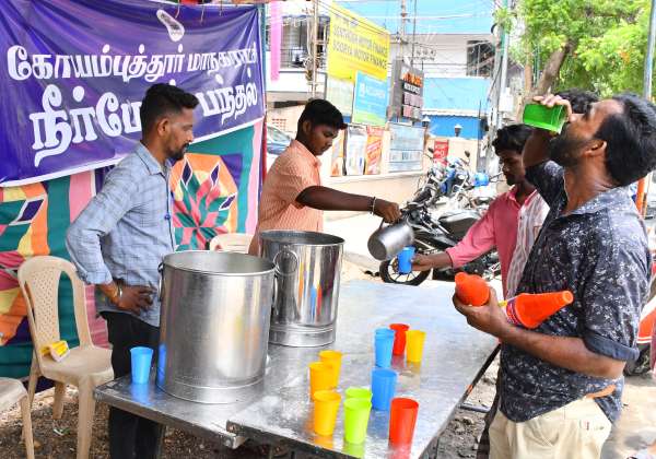 கோவையில் பல்வேறு இடங்களில் மாநகராட்சி சார்பில் நீர்மோர் பந்தல் அமைக்கப்பட்டுள்ளது. இடம்: சிவானந்த காலனி.