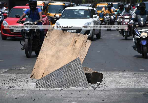சென்னை தி.நகர் ஜி.என்.செட்டி சாலையில் பாதாள சாக்கடை மூடி சேதமடைந்து, வாகன ஓட்டிகளுக்கு ஆபத்து ஏற்படுத்தும் வகையில் விடப்பட்டுள்ளது. அசம்பாவிதம் நிகழட்டும் என்று காத்திருக்கிறார்களா அலுவலர்கள்?
