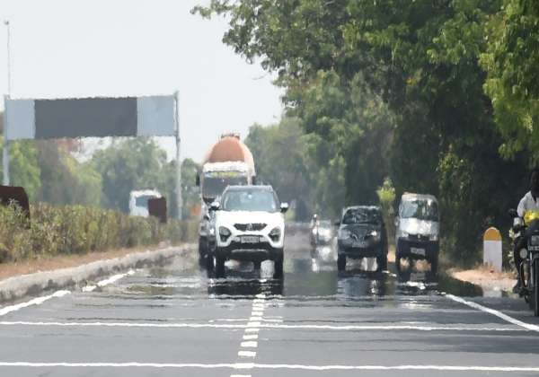 வெயிலின் தாக்கத்தால் சாலையில் பெருக்கெடுத்து ஓடுகிறது கானல் நீர். இடம் : விழுப்புரம்