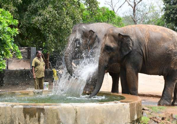 வண்டலூர் உயிரியல் பூங்காவில் வெயிலுக்கு இதமாக குளிக்கும் யானைகள்