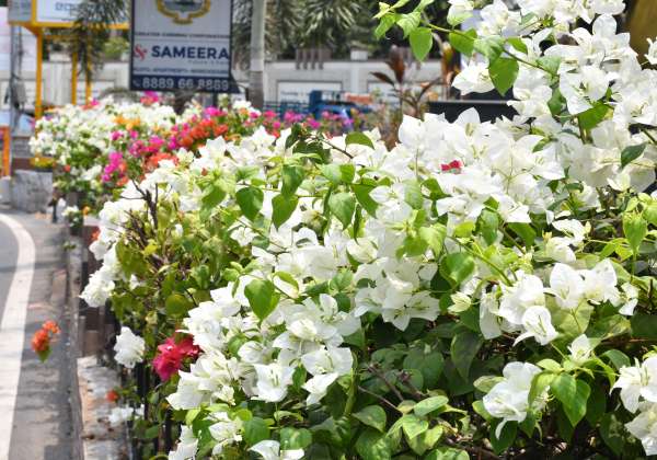 சென்னையில் நாளுக்கு நாள் வெயிலின் தாக்கம் அதிகரித்து வரும் நிலையில் வாகன ஓட்டிகளின் கண்களுக்கு குளிர்ச்சி அளிக்கும் வகையில் சாலை மைய தடுப்புகளில் வைக்கப்பட்டுள்ள செடிகளில் பூத்து குலுங்கும் காகித பூக்கள்.இடம்: நுங்கம்பாக்கம்.