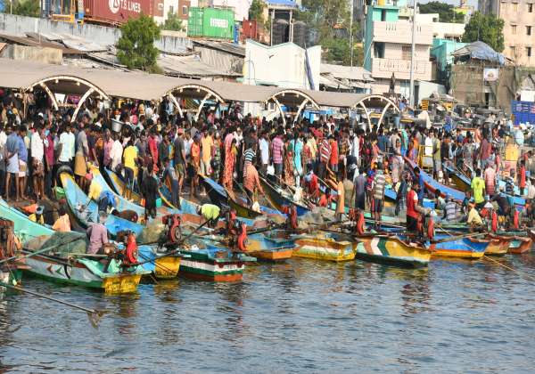 சென்னை காசிமேடு மீன்பிடி துறைமுகத்தில் மீனவர்கள் வாங்க குவிந்த மக்கள் கூட்டம்.