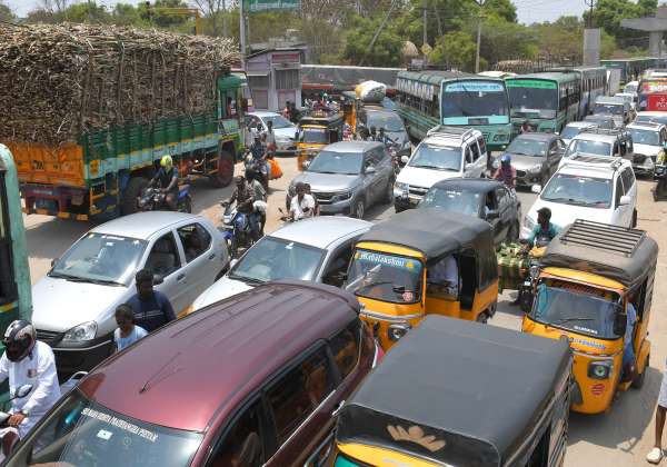 தேனி - மதுரை ரோட்டில் ஏற்பட்ட கடுமையான போக்குவரத்து நெரிசலால் 2 மணி நேரத்திற்கு மேலாக அணிவகுத்து நின்ற வாகனங்கள். இடம் : அரண்மனைப்புதூர்