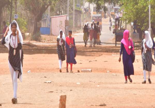 அக்கி நட்சத்திரம் துவங்கியதால் வெயிலின் தாக்கம் அதிகமாக இருந்ததால் மாணவிகள் தலையில் துப்பட்டா அணிந்து சென்றனர்.இடம்: சிவகங்கை