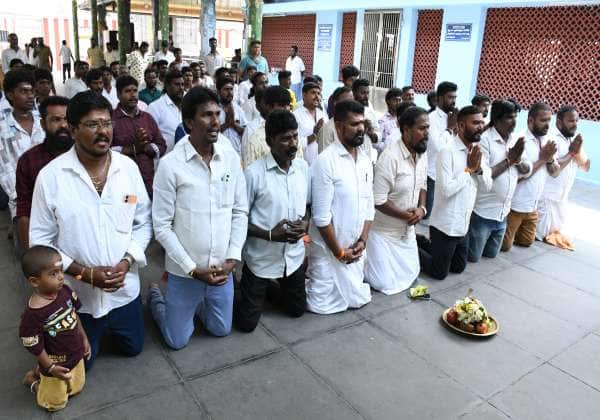 இந்து முன்னணி சார்பில் மழை வேண்டி கோவை கோனியம்மன் கோவிலில் முட்டியிட்டு பிரார்த்தனை நடத்தினர்.