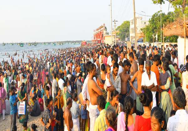 சித்திரை அமாவாசை யொட்டி ராமேஸ்வரம் ராமநாதசுவாமி கோயில் அக்னி தீர்த்த கடலில் ஏராளமான பக்தர்கள் புனித நீராடினார்கள்.