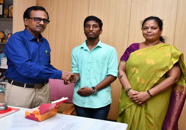 பிளஸ் 2 பொதுத் தேர்வில், அரசு பள்ளிகளில் சென்னை மாவட்ட அளவில் முதல் மதிப்பெண் பெற்ற, சென்னை எம்.ஜி.ஆர் நகர் அரசு ஆண்கள் மேல்நிலைப் பள்ளியை சேர்ந்த மாணவர் ஜெகதீஸ்வரனை, பள்ளியின் தலைமை ஆசிரியர் மணிமாறன் பாராட்டினார். உடன் ஆசிரியை பத்மினி.