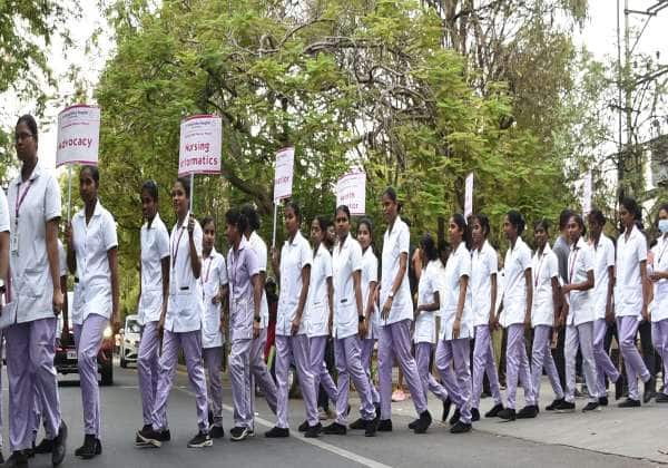 செவிலியர் தினத்தை முன்னிட்டு கோவை ரேஸ்கோர்சில், ராமகிருஷ்ணா மருத்துவமனை சார்பில் வாக்கத்தானில் கலந்து கொண்ட மாணவிகள்.