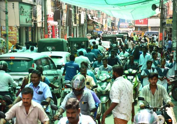 தீபாவளி பண்டிகை ஒட்டி கோவை பெரிய கடை வீதியில் புத்தாடை வாங்க குவிந்த மக்கள்.