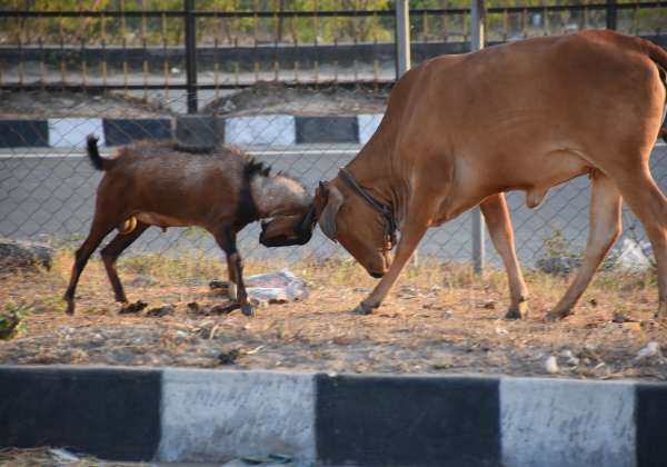 நீயா? நானா? வா மோதி பார்ப்போம் என சண்டை போடும் கால்நடைகள். இடம். திண்டிவனம், மரக்காணம் சாலை.