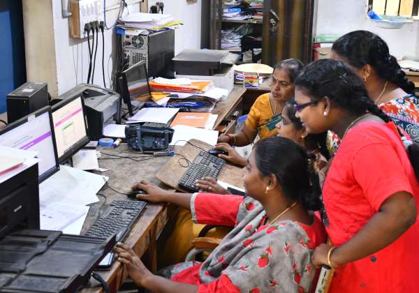 பத்தாம் வகுப்பு தேர்வு முடிவுகள் வெளியானதை ஆர்வமாக பார்வையிடும் ஆசிரியர்கள்.இடம்:- பழனியம்மாள் பள்ளி, திருப்பூர்.