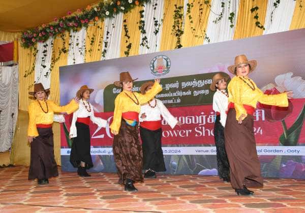 ஊட்டி தாவரவியல் பூங்காவில், மலர் கண்காட்சியில், திபெத்தியர்களின் நடனம் இடம்பெற்றது.