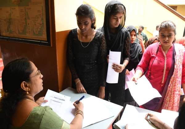 கோவை திருச்சி ரோடு சென்ட் மேரி பள்ளியில் 11 ஆம் வகுப்பில் சேர்வதற்கான விண்ணப்பம் வாங்கும் மாணவி.