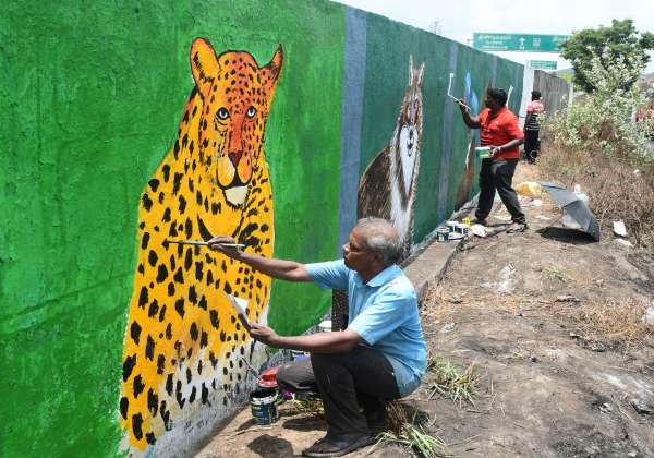 இரும்பூலியூர் ரயில்வே மேம்பாலம் சுவரில் தாம்பரம் மாநகராட்சி சார்பில் அழகிய ஓவியங்கள் வரையப்பட்டு வருகிறது.