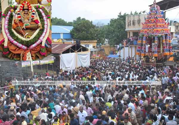 தேனி மாவட்டம் வீரபாண்டி கவுமாரியம்மன் கோயில் சித்திரை திருவிழா தேரோட்டம் நடந்தது.(உள் படம்) அலங்காரத்தில் கவுமாரியம்மன்