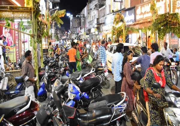 அட்சய திருதியை முன்னிட்டு விழுப்புரம் காமராஜர் தெருவில் போக்குவரத்து வாகனங்கள் சாலையில் நிறுத்தி வைப்பதால் பொதுமக்களுக்கு இடையூறாக காட்சி அளிக்கிறது.