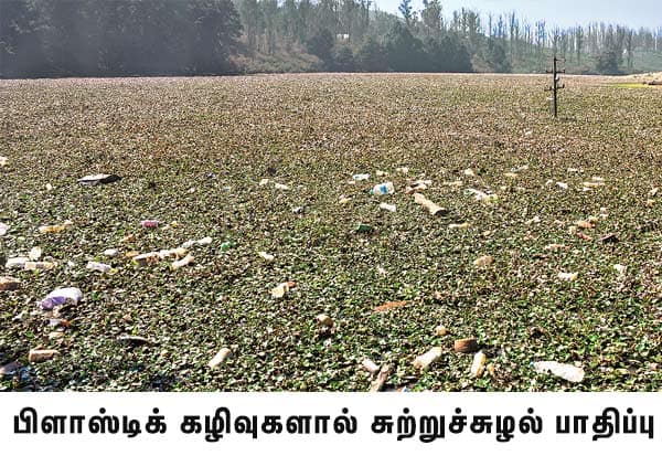 ஊட்டி காமராஜர் சாகர் அணையின் கரையோரம் வளர்ந்துள்ள ஆகாய தாமரை; பிளாஸ்டிக் கழிவுகளால் பெரும் சுற்றுச்சுழல் பாதிப்பு ஏற்பட்டு வருகிறது.