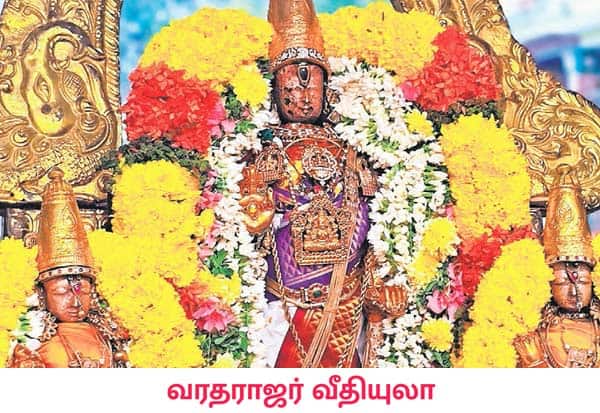 தை மாத ஏகாதசி தினத்தில், ஸ்ரீதேவி, பூதேவியருடன் மலர் அலங்காரத்தில் காஞ்சிபுரம் வரதராஜ பெருமாள் வீதியுலா வந்தார்.