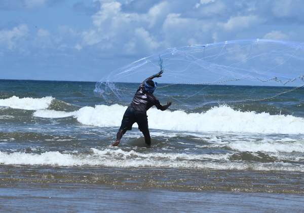 மீன்பிடி தடைக் காலத்தை யொட்டி வயிற்று பிழைப்பிற்காக கரையில் இருக்கும் மீன்களை பிடிப்பதற்கு வலை வீசும் மீனவர்.