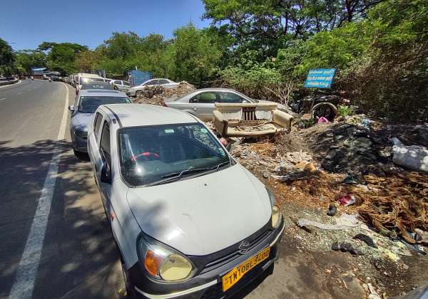 அறிவிப்பு பலகை இருந்தும் கொட்டப்பட்டுள்ள குப்பை மற்றும் நிறுத்து வைக்கப்பட்டுள்ள தனியார் வாகனங்கள். இடம் : நியூ ஆவடி சாலை, அண்ணாநகர் கிழக்கு