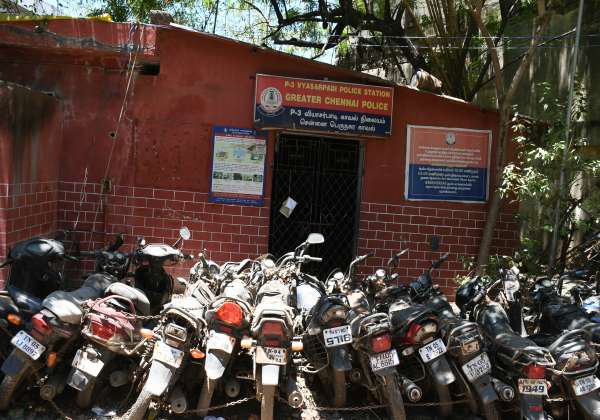 சென்னையில் பல்வேறு வழக்குகளில் போலீசாரால் பறிமுதல் செய்யப்பட்ட வாகனங்கள் இருசக்கர வாகனங்கள்.இடம்: வியாசர்பாடி.