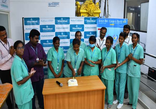 புதுச்சேரி இசிஆர் வெஸ்ட் மேட் மருத்துவமனையில், நடந்த சர்வதேச செவிலியர் தின விழாவில் செவிலியர் கேக் வெட்டி கொண்டாடினர்.