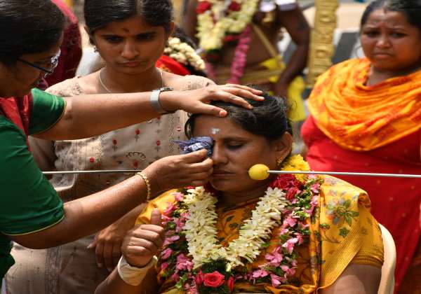 கோவை சுந்தராபுரம் காமராஜ் நகர் ஜெய மாரியம்மன் கோயிலில் திருவிழாவையொட்டி அழகு குத்திக்கொண்டு நேர்த்திக்கடன் செலுத்திய பக்தர்கள்.