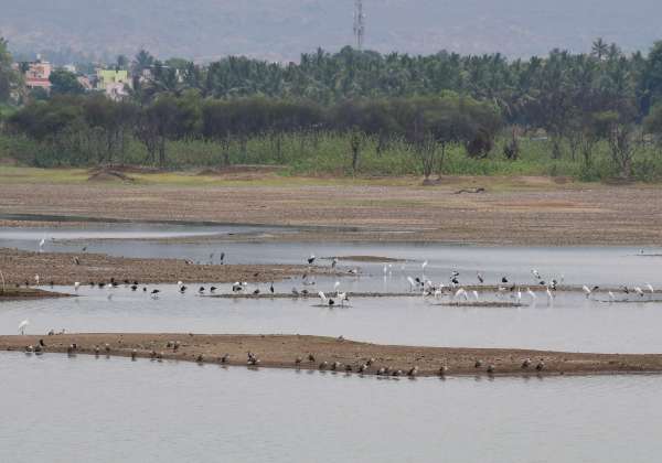 கோவை பேரூர் பெரிய குளத்தில் உணவு தேடி அதிக அளவில் குவிந்துள்ள பறவைகள்.
