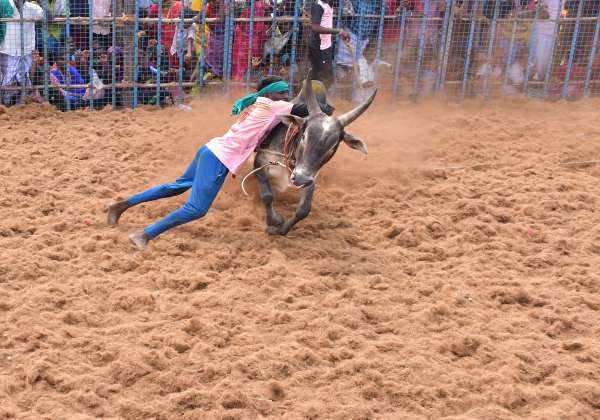 விருதுநகர் மாவட்டம் நரிக்குடி அருகே செம்பொன் நெருஞ்சில் காளையை பிடிக்கும் மாடு பிடி வீரர்.