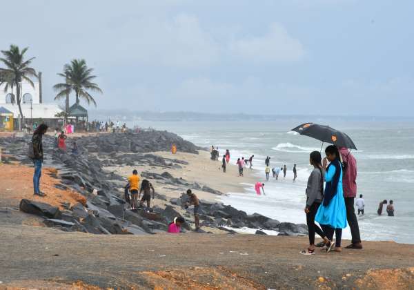 புதுச்சேரி கடற்கரையில் சுற்றுலா பயணிகள் குடை பிடித்தபடி சென்றனர்.