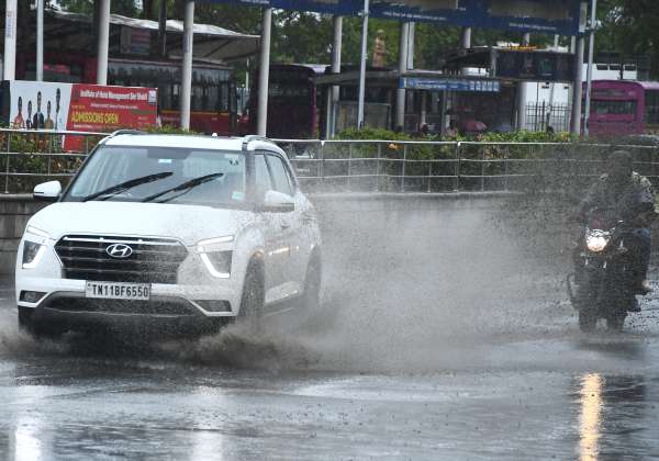 சென்னையில் பெய்து வரும் மழையால், சாலையில் தேங்கியுள்ள நீரில் சீறிப்பாய்ந்து செல்லும் வாகன ஓட்டிகள். இடம். காமராஜர் சாலை.