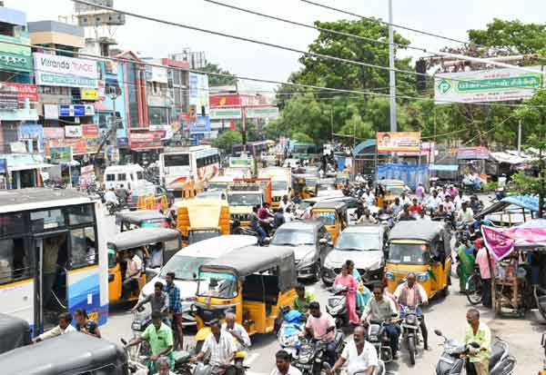 திருவண்ணாமலை பஸ் நிலையம் அருகே போக்குவரத்து நெரிசலில் சிக்கிய வாகன ஓட்டிகள்.