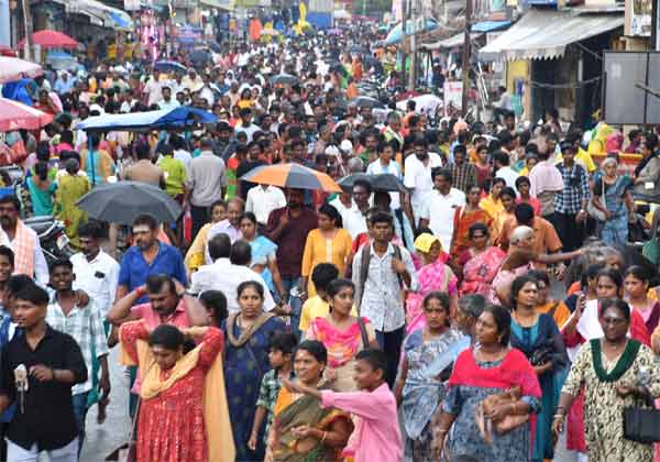 திருவண்ணாமலையில் வைகாசி மாத பவுர்ணமியில் லேசான மழையில் குடை பிடித்து கிரிவலம் செல்லும் பக்தர்கள் கூட்டத்தின் ஒரு பகுதி