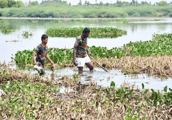 திருப்பூர், நஞ்சராயன் குளத்தில் இறந்த மீன்களை அப்புறப்படுத்தும் பணியில் ஈடுபட்ட வனத்துறையினர்.