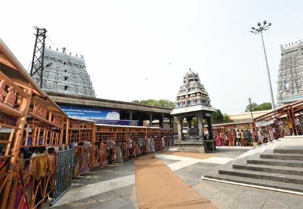 திருவண்ணாமலை அருணாசலேஸ்வரர் கோயிலில் சுவாமி தரிசனம் செய்ய நான்காம் பிரகாரத்தில் நீண்ட வரிசையில் காத்திருந்த பக்தர்கள்.