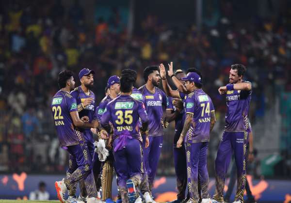 ஹைதரபாத் அணியின் டிராவிஸ் ஹெட்டின் விக்கெட்டை வீழ்த்திய மகிழ்ச்சியில் கோல்கட்டா அணி வீரர்கள். இடம்: சென்னை சேப்பாக்கம் மைதானம்.