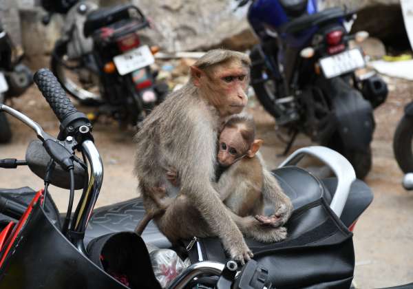 சுற்றுலா பயணிகள் உணவு எதுவும் தருவார்களா என எதிர்பார்த்து இருசக்கர வாகனத்தில் குட்டியுடன் அமர்ந்திருக்கும் குரங்கு.