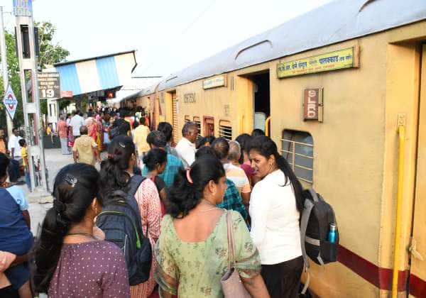 பாலக்காட்டிலிருந்து சென்னை வரை செல்லும் விரைவு ரயிலில் ஏறும் பயணிகள் கூட்டம்.இடம்.உடுமலை ரயில்வே ஸ்டேஷன்.