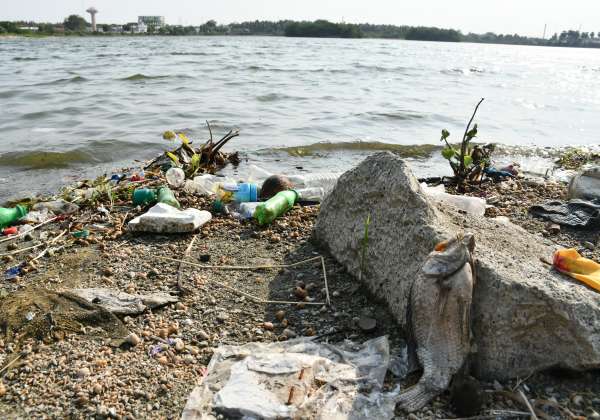 திருப்பூர், ஆண்டிபாளையம் குளத்தின் கரையோரங்களில் மிதக்கும் பிளாஸ்டிக் கழிவுகள்.
