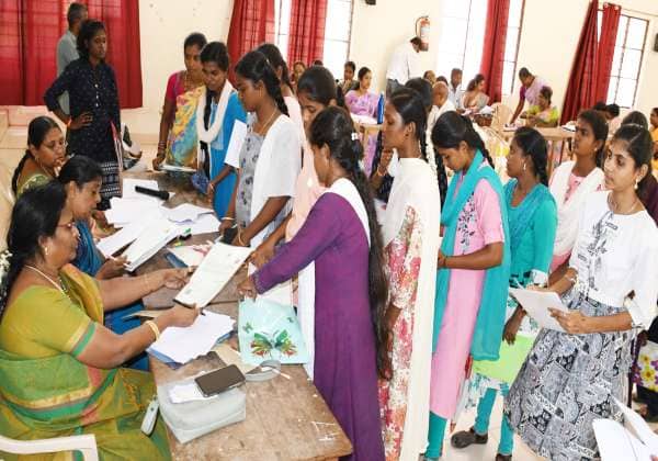 திண்டுக்கல் எம்.வி.எம்., அரசு மகளிர் கல்லூரியில் நடந்த கவுன்சிலிங்கில் பங்கேற்ற மாணவிகள்.