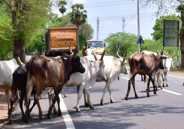 ரோட்டில் திரியும் பசு மாடுகளால் வாகன ஓட்டிகளுக்கு விபத்தை ஏற்படுத்துகிறது.இடம்: சிவகங்கை - மதுரை ரோடு