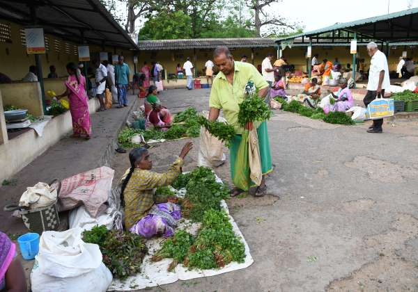 உடுமலை உழவர் சந்தையில் சேதமடைந்துள்ள தரையில் அமர்ந்து கீரை விற்பனை செய்யும் விவசாயிகள்.