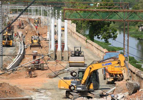 சென்னை கடற்கரை-எழும்பூர் இடையே நான்காவது புதிய ரயில் பாதை கனரக இயந்திரங்கள் கொண்டு அமைக்கும் பணிகள் விறுவிறுப்பாக நடந்து வருகிறது. இடம்: பூங்கா ரயில் நிலையம்.