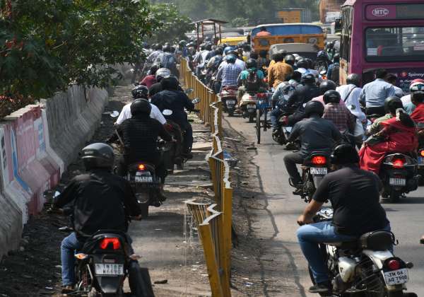 போக்குவரத்து நெரிசலில் சிக்கித் தவிக்கும் வாகன ஓட்டிகள். பாதசாரிகளுக்கு இடையூறாக நடைபாதையில் இரு சக்கர வாகனங்களை ஒட்டி செல்கின்றனர்.இடம்: பேசின் பிரிட்ஜ்.