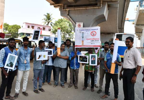 உலக புகையிலை ஒழிப்பு தினத்தை முன்னிட்டு, சென்னை மாநகராட்சி ஊழியர்கள் கைகளில் பதாகைகள் ஏந்தி பொதுமக்களிடம் விழிப்புணர்வு ஏற்படுத்தினர். இடம் : ரெட்டேரி ஜங்ஷன்