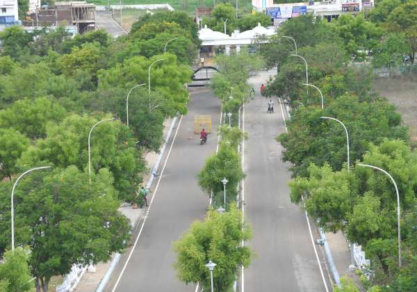 சமீபத்தில் பெய்த தொடர் மழையால் தேனி கலெக்டர் அலுவலக நுழைவு வாயில் இருபுறமும் பசுமையாக காட்சியளிக்கும் மரங்கள்.